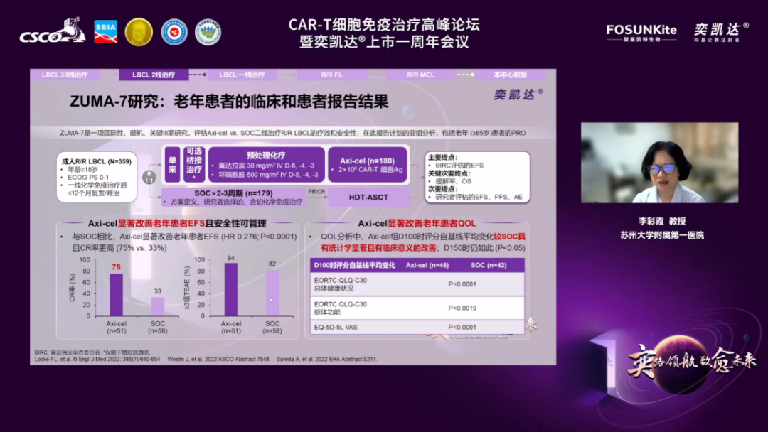 随后,由复旦大学附属肿瘤医院陶荣教授主持,华中科技大学同济医学院附属同济医院黄亮教授总结经验,带来《奕凯达®的患者适用人群及其循证证据》专题分享,从疾病类型、年龄、体能状态评分、肿瘤包块、CNS病史、双/三打击与否、胃肠道受累、HBV感染、生化指标、TFL以及TP53突变多角度一一分析患者应用CAR-T治疗的获益情况,为更多医护工作者带来启示,也为患者精准定位和获益提供重要参考。