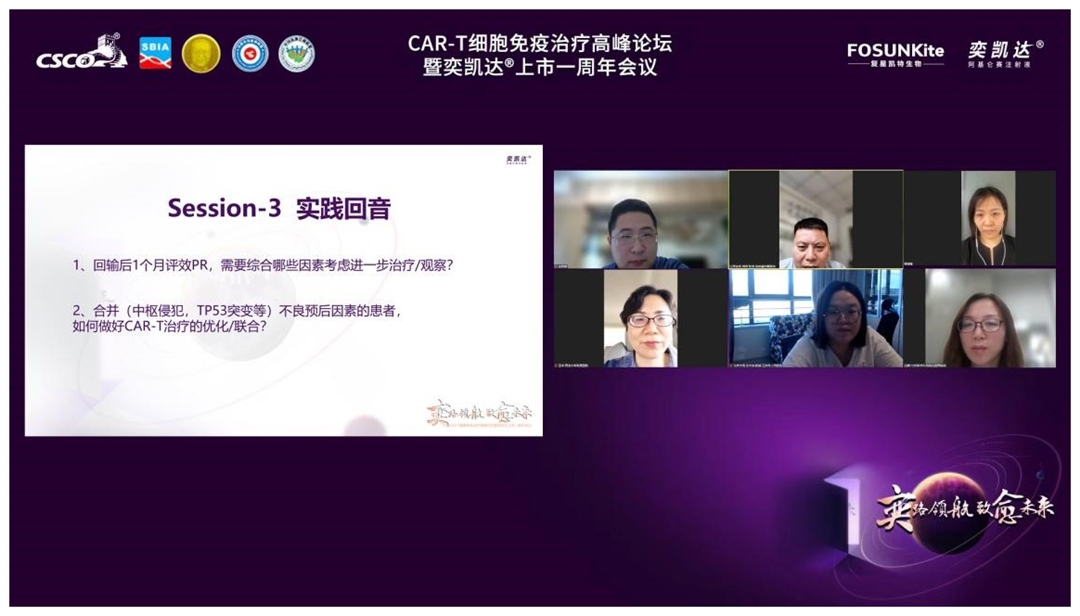 讨论环节由复旦大学附属中山医院刘澎教授主持,上海交通大学医学院附属瑞金医院吴文教授、江苏省人民医院徐卫教授、复旦大学附属肿瘤医院曹军宁教授、华中科技大学同济医学院附属同济医院肖毅教授、上海市同济医院李萍教授同Prof. YiLin、王黎教授针对CAR-T临床治愈证据与LBCL治疗目标策略展开讨论。